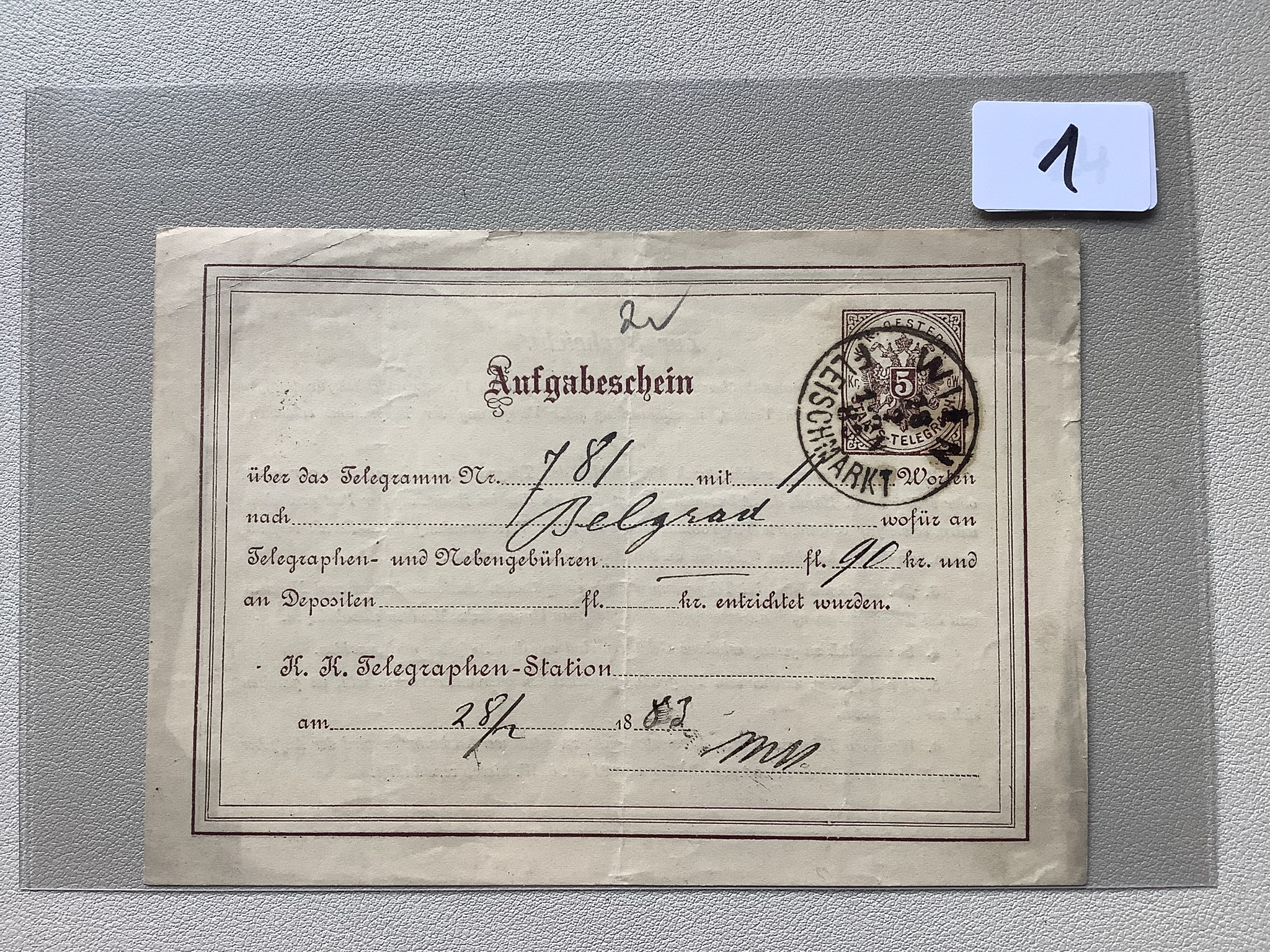 1883, brauner einsprachiger Aufgabeschein für ein Telegramm nach Belgrad, 5 Kreuzer Wertstempel, Stpl. WIEN/FLEISCHMARKT 28.02.83 6